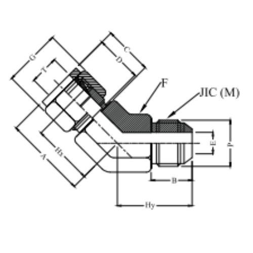 | Model JICo. | T Tube OD | P JIC Male | A | B | C | D | E Min. | F A/F | G A/F | Hx | Hy |